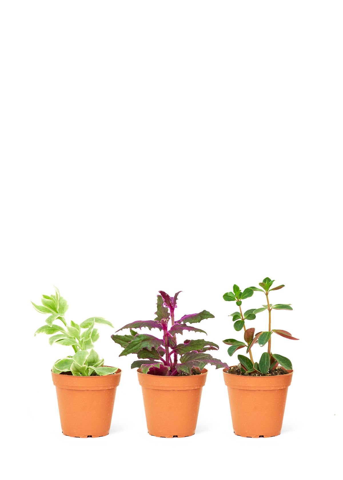 This bundle of three baby tropical plants (2" pot diameter) offers a solution for those seeking a visually pleasing addition to their space. They are adaptable to different lighting situations and are perfect as a gift.