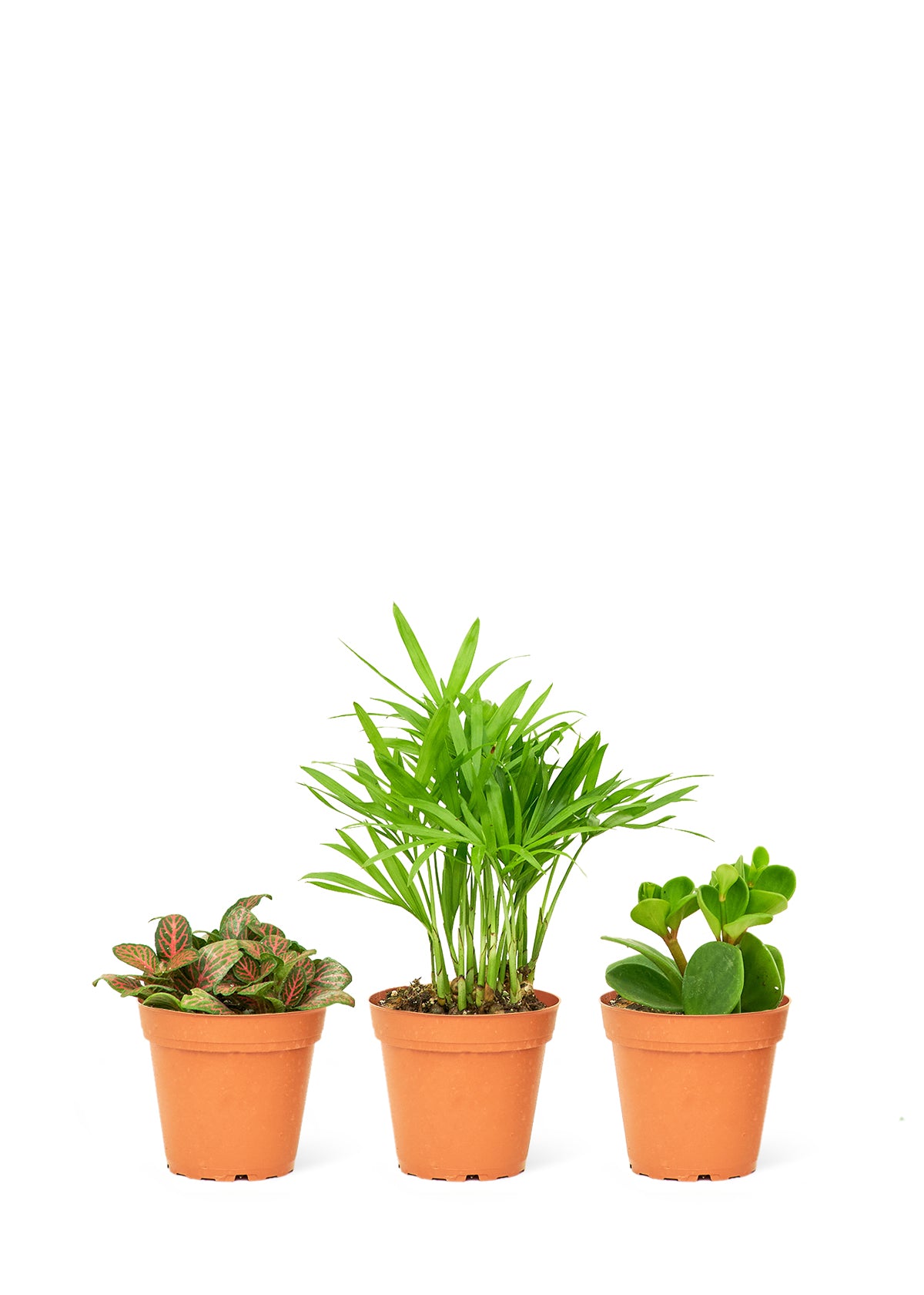 This bundle of three baby plants (2" pot diameter) offers a solution for those seeking non-toxic plant additions to their space. They are adaptable to different lighting situations and are perfect as a gift.