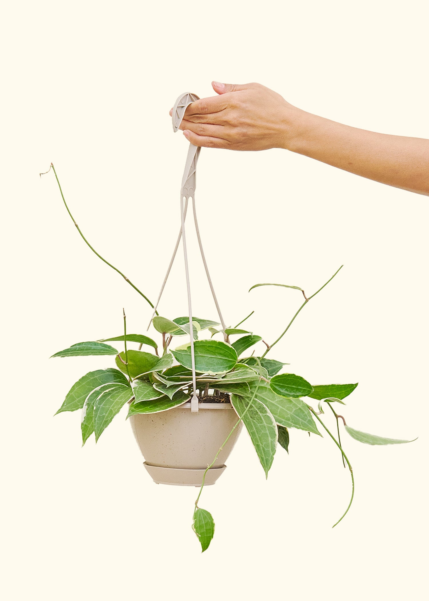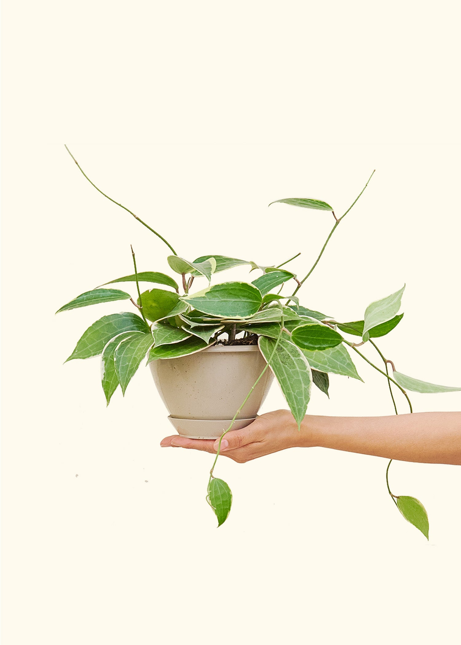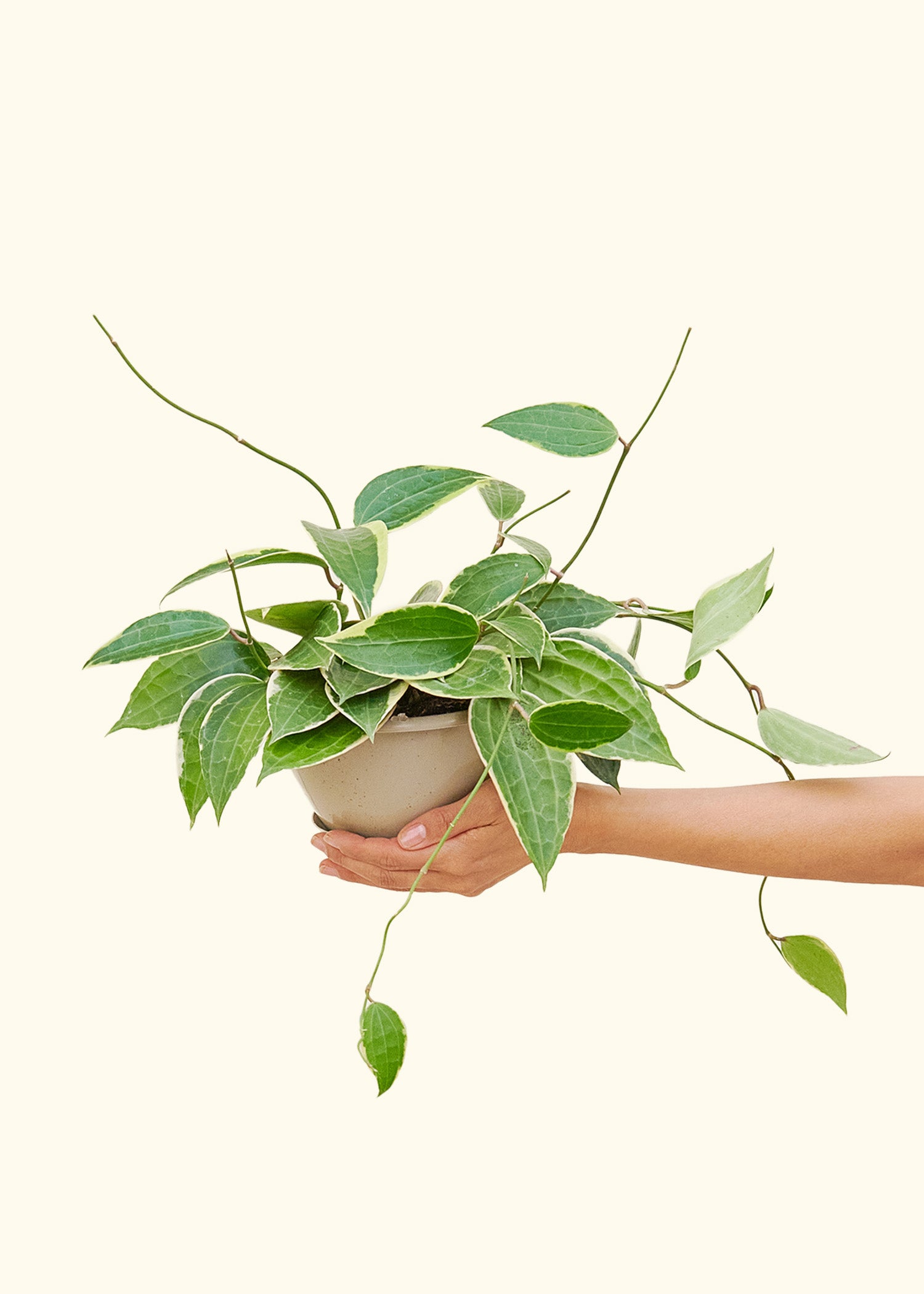 This rare and unique hoya has white variegation along the outer edge and patches of cream and white. With proper care, it can bloom fragrant, star-shaped flower clusters in the summer.