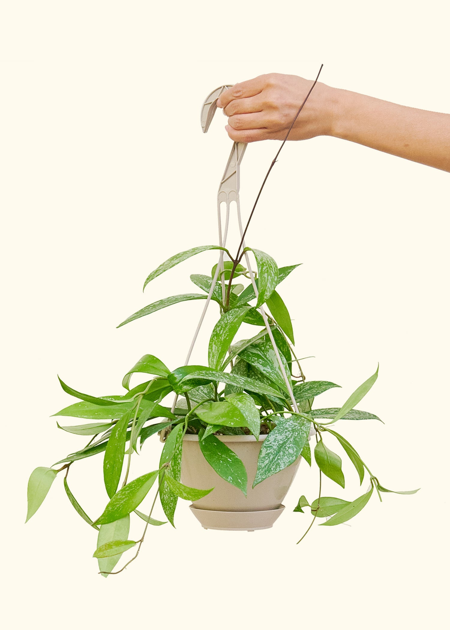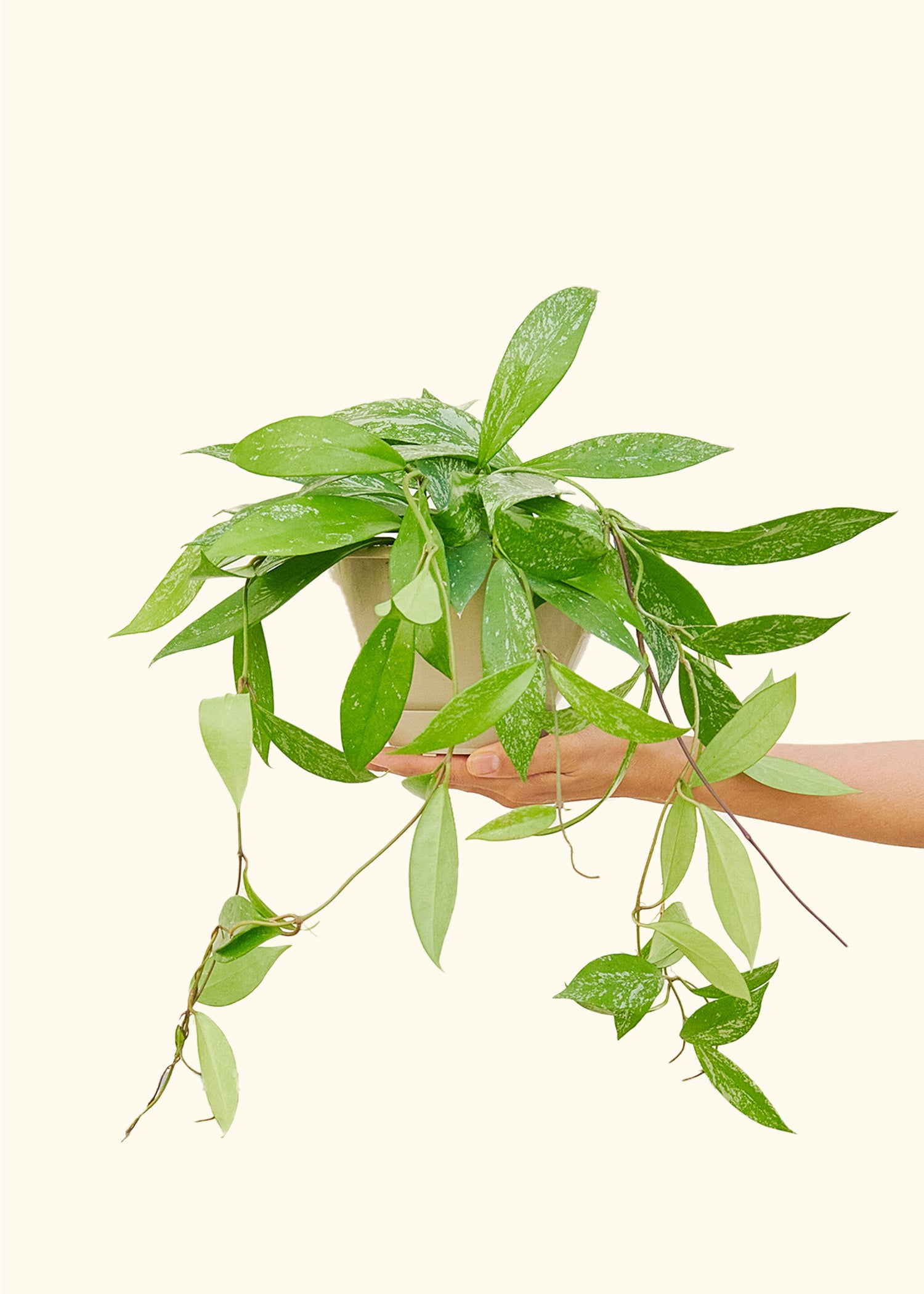 This fast-growing hoya has unique green and waxy leaves with splashes of silver variegation. With a lot of sunlight, the leaves may gain a pinkish hue. With proper care and patience, this hoya can bloom fragrant, star-shaped flower clusters.