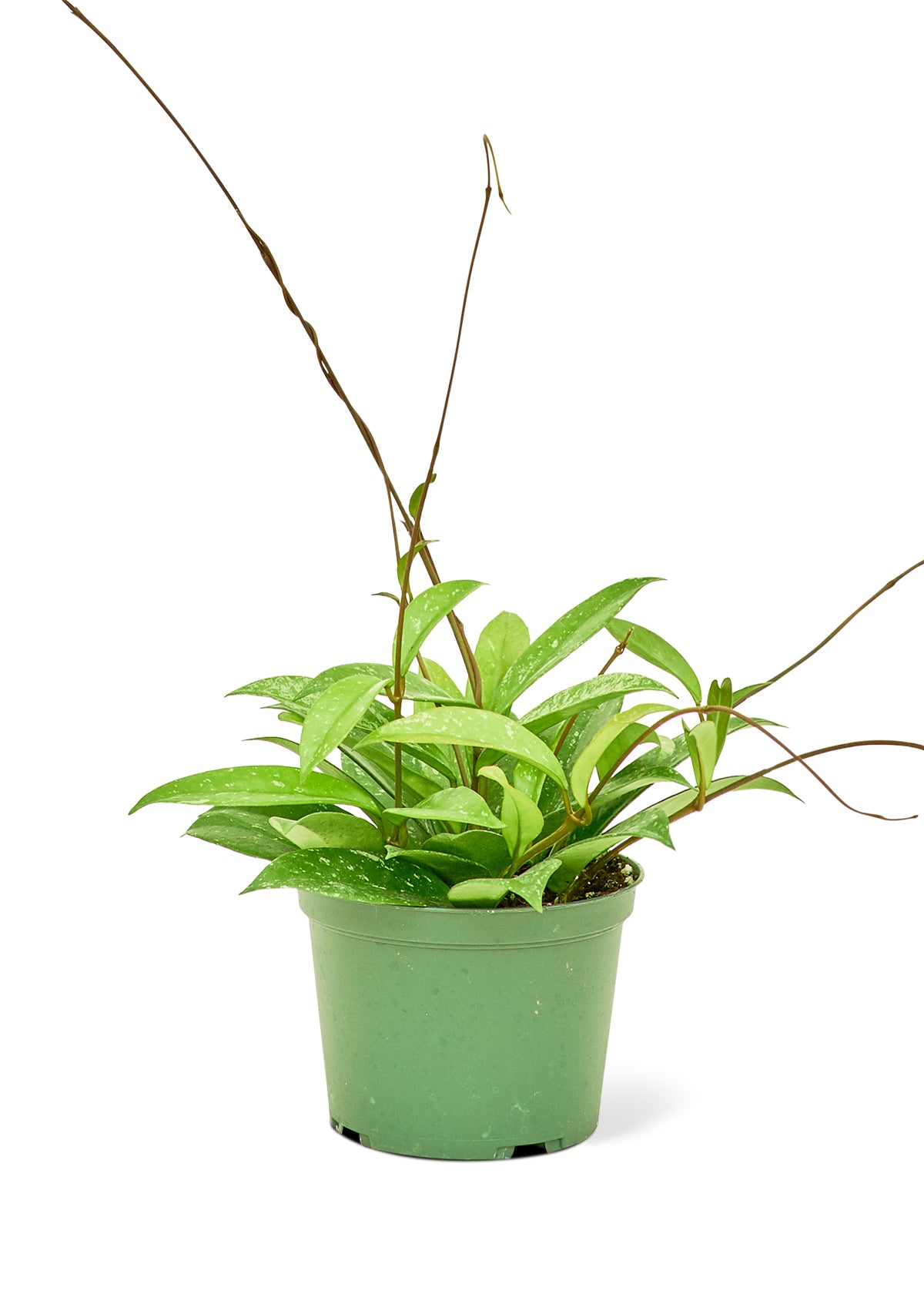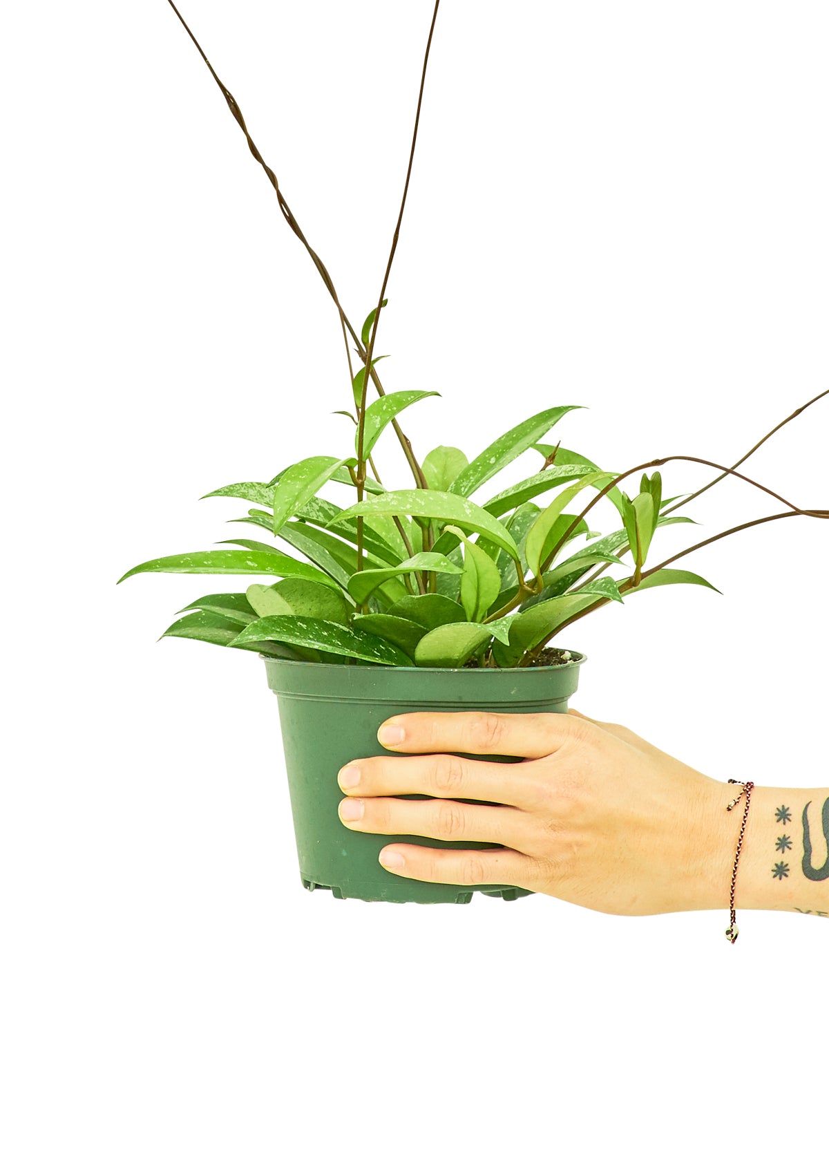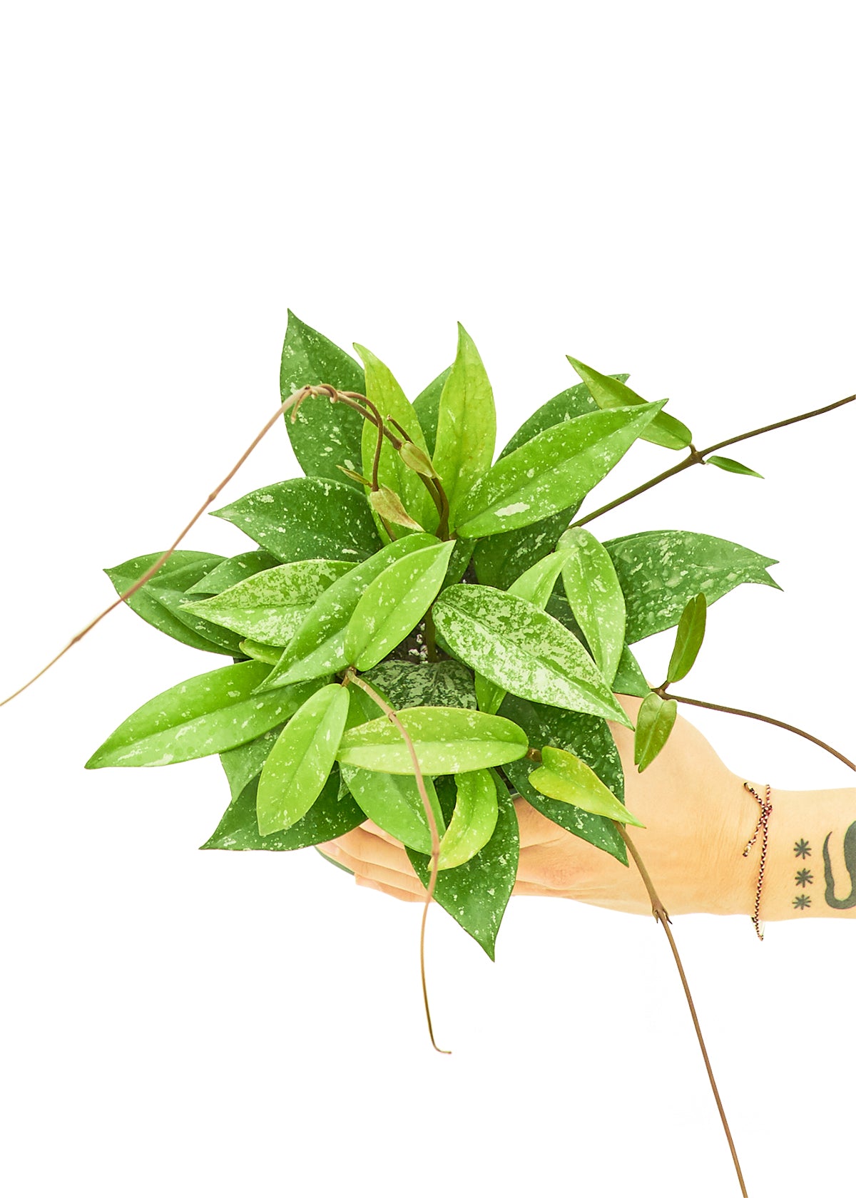 This fast-growing hoya has unique green and waxy leaves with splashes of silver variegation. With a lot of sunlight, the leaves may gain a pinkish hue. With proper care and patience, this hoya can bloom fragrant, star-shaped flower clusters.