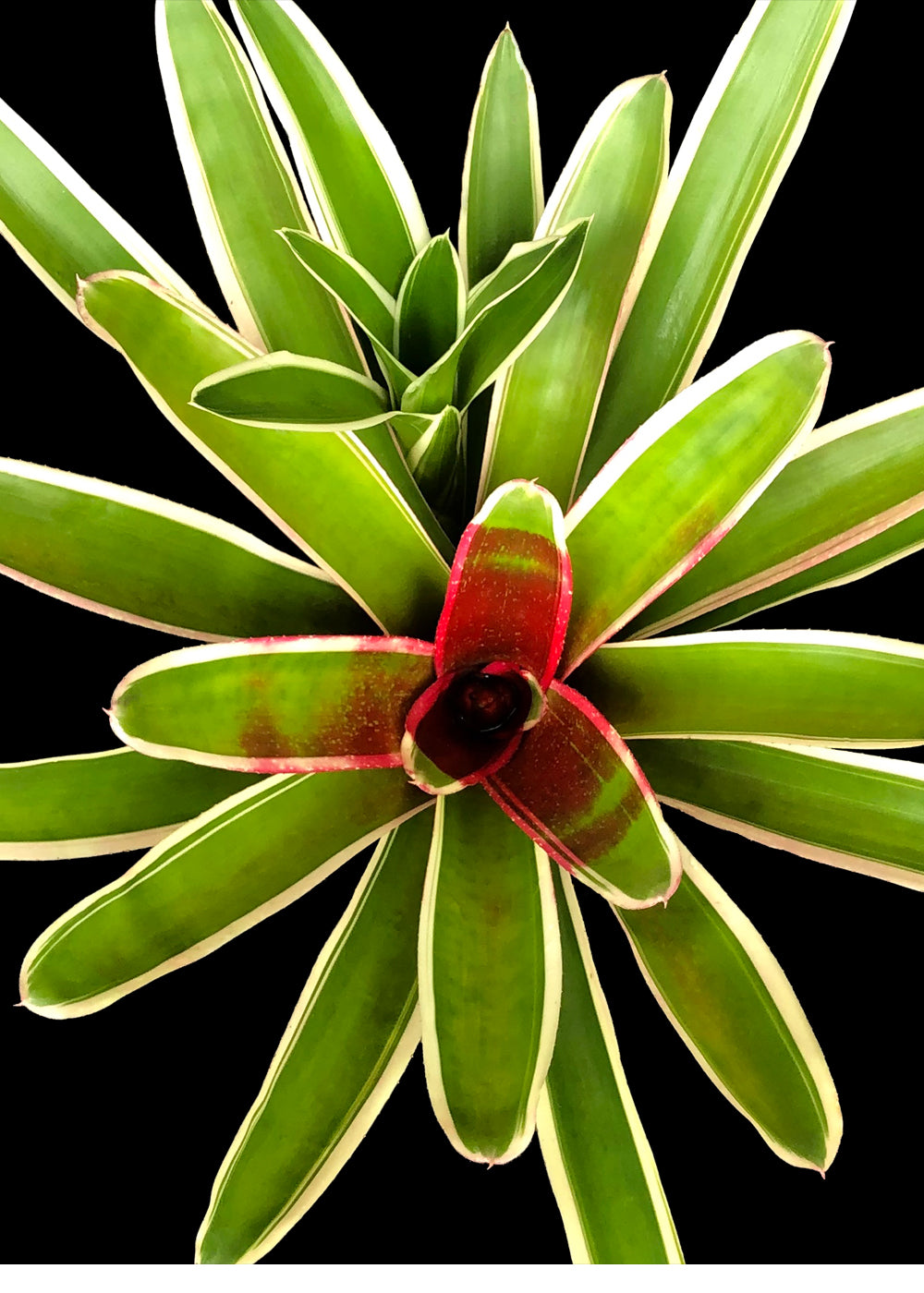 - Description: Albomarginated green stoloniferous foliage and a bright red center.